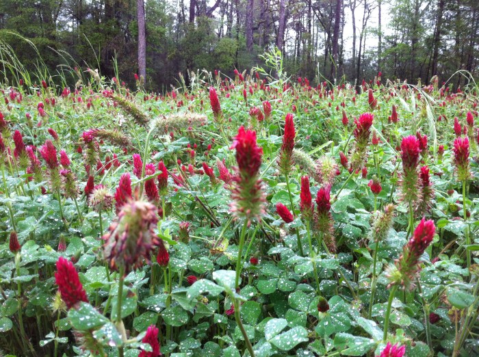 The crimson clover are in full bloom and make a showy front against the wet greens of the day. I found a few other wildflowers, but haven’t tried to identify them.