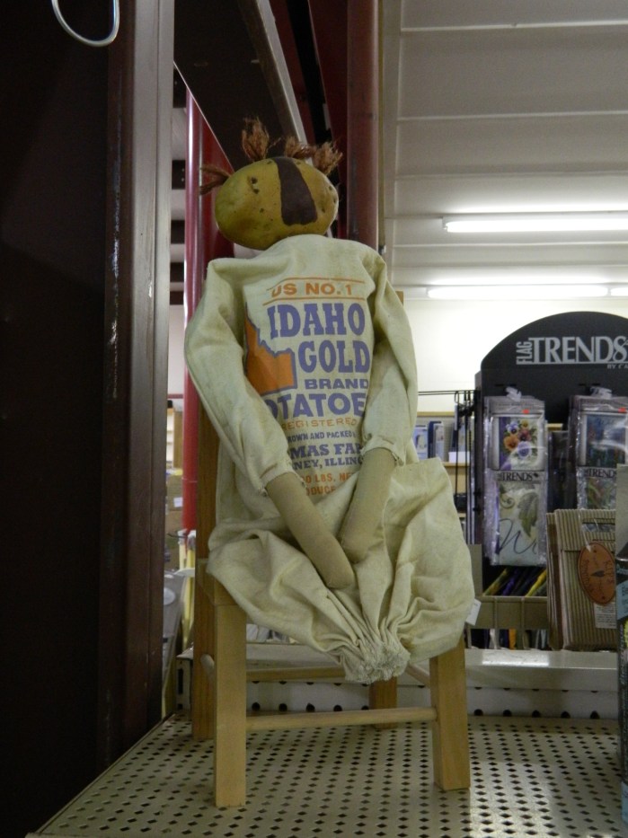 There is one item even a tacky tolerant person like myself would not buy. That is the potato head doll. Yes, a celebration of poverty, when a family could not afford a real doll. “Let’s make a doll out of a potato sack and give it a potato head, it will look so cute!” did not fool children even during the depression. Why the Village Discount center is selling a copy of a doll no one wanted even in the old days is beyond my comprehension. The head isn’t even a real potato, it’s plastic.