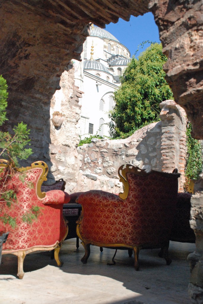 We have tea and baklava on the sidewalk here, but didn’t discover this lovely patio at the back until later
