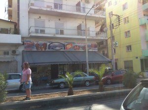 After our short trip to the Parthenon, and not wishing to be caught too far from the ship in the midst of a transportation strike, four of us decided to find a local place to have a late lunch, and started walking uphill from the dock. Our criteria was pretty simple: a local restaurant and not pizza. The area immediately around the docks is a working-class neighborhood, and the street we chose was lined with hardware stores and the like.