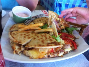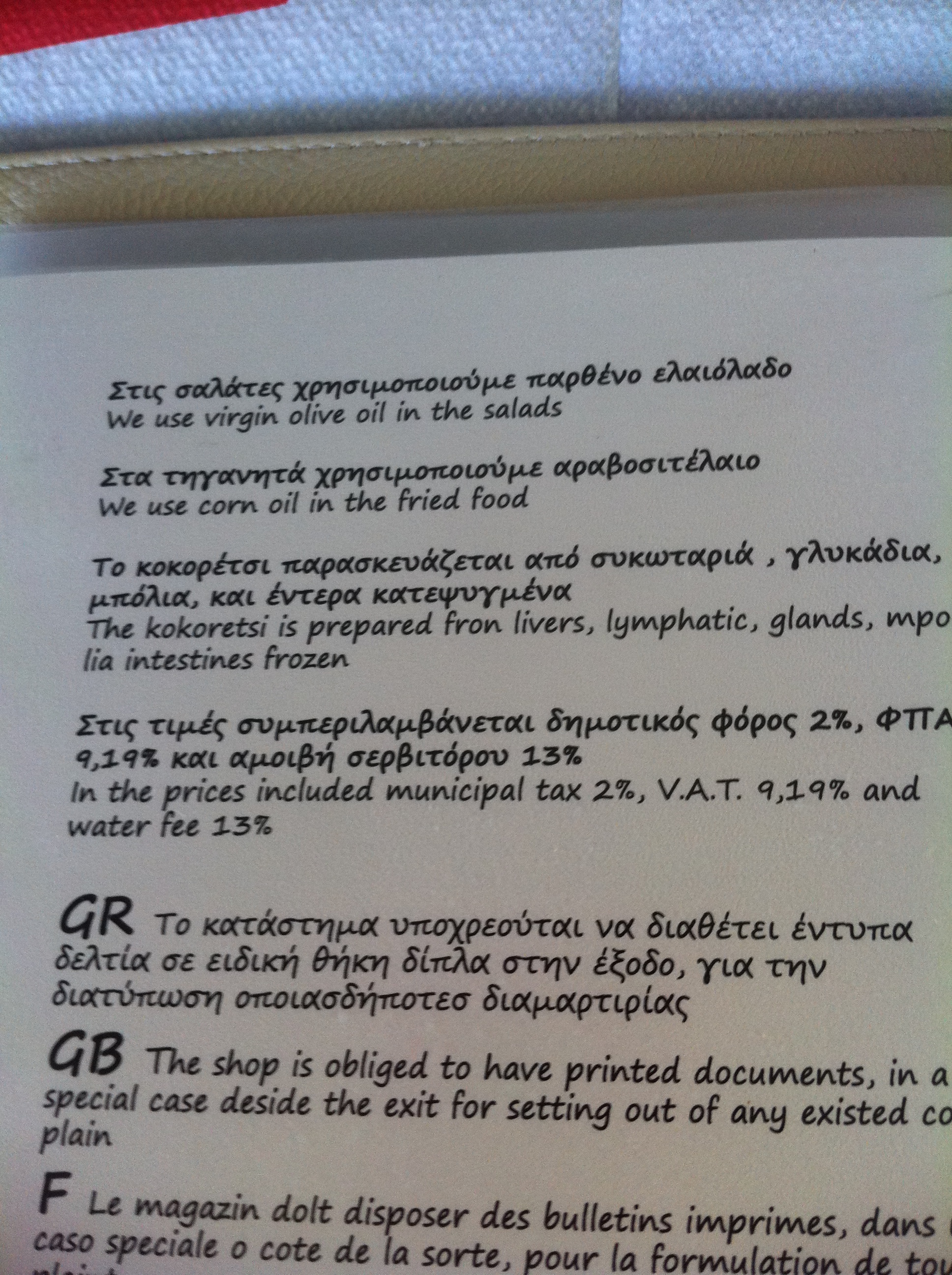 We found this little place. From the reactions of the staff, we realized they don’t get a lot of tourists. No one spoke English, but fortunately the menu had English translations, of a type (Greeklish?) Most of the food we encountered on our trip centered around pita, chicken, and tomatoes, and this was no different. A shwarma by any other name…