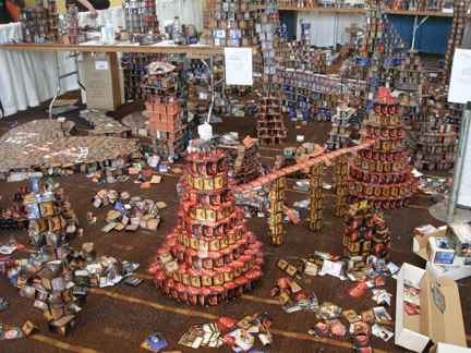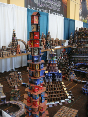 Cardhalla is where old ccg (collectible card games) cards go to die an honorable death. Boxes and boxes of extra common cards and cards from dead ccgs are gathered by the Cardhalla organizers. Then gamers of all sorts build card houses, card towers, card bridges, and in the end it becomes a massive card city. People start building on the opening day of the con, and many work until the wee hours on their structures. I have seen marvelous structures done with love and great imagination. I have seen a working waterworks built prior to the convention that two guys put over 150 hours into building, and saw it actually run. Everyone is welcome to join in on the fun, and young and old alike will sit and build. Since these structures are built by gamers, some of them are quite tricky and built solidly with internal support structures. Cards are folded, stacked, and sometimes slotted into each other. Some of the towers reach remarkable heights, and the bridges span surprising distances.