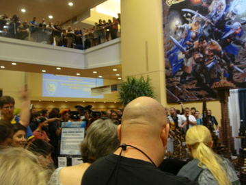However, the destruction itself is far from sad; it is quite gleeful. GenCon has a designated charity each year, and various events throughout the con raise funds. Cardhalla is one of these. On Saturday evening, people gather to throw coins at it, to bring it down. The auctioneer from the games auction event presides and auctions off the first coin toss. This is a fun thing, because people will start pooling funds from friends, strangers, anyone nearby, who can toss them a couple of bucks. In the end, there is one or sometimes two individuals who raise big bucks for that first toss. This year, two bidders competed with people around them passing funds (or from the balcony above!) to add to their totals. Between them, the two people raised $1652 for the privilege of the first coin toss.