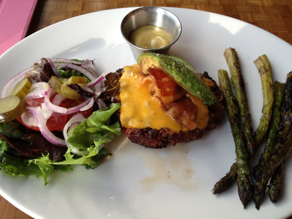 The little market had a full deli, a gorgeous salad bar, a soup counter, a gelato center. Prepared foods as well as fresh cuts of meats and chicken were displayed behind the but her counter. You could get selections to go, or have them cooked fresh to eat on site. I chose a “cowboy burger” that was fresh ground beef (you could also choose bison or salmon burgers), which was mixed with jalapeños, cheddar, bits of bacon, and seasonings. I eat my burgers by less, with knife and fork. The fixin’s for my sandwich were a lovely mixed green lettuce, pickles, red onions,