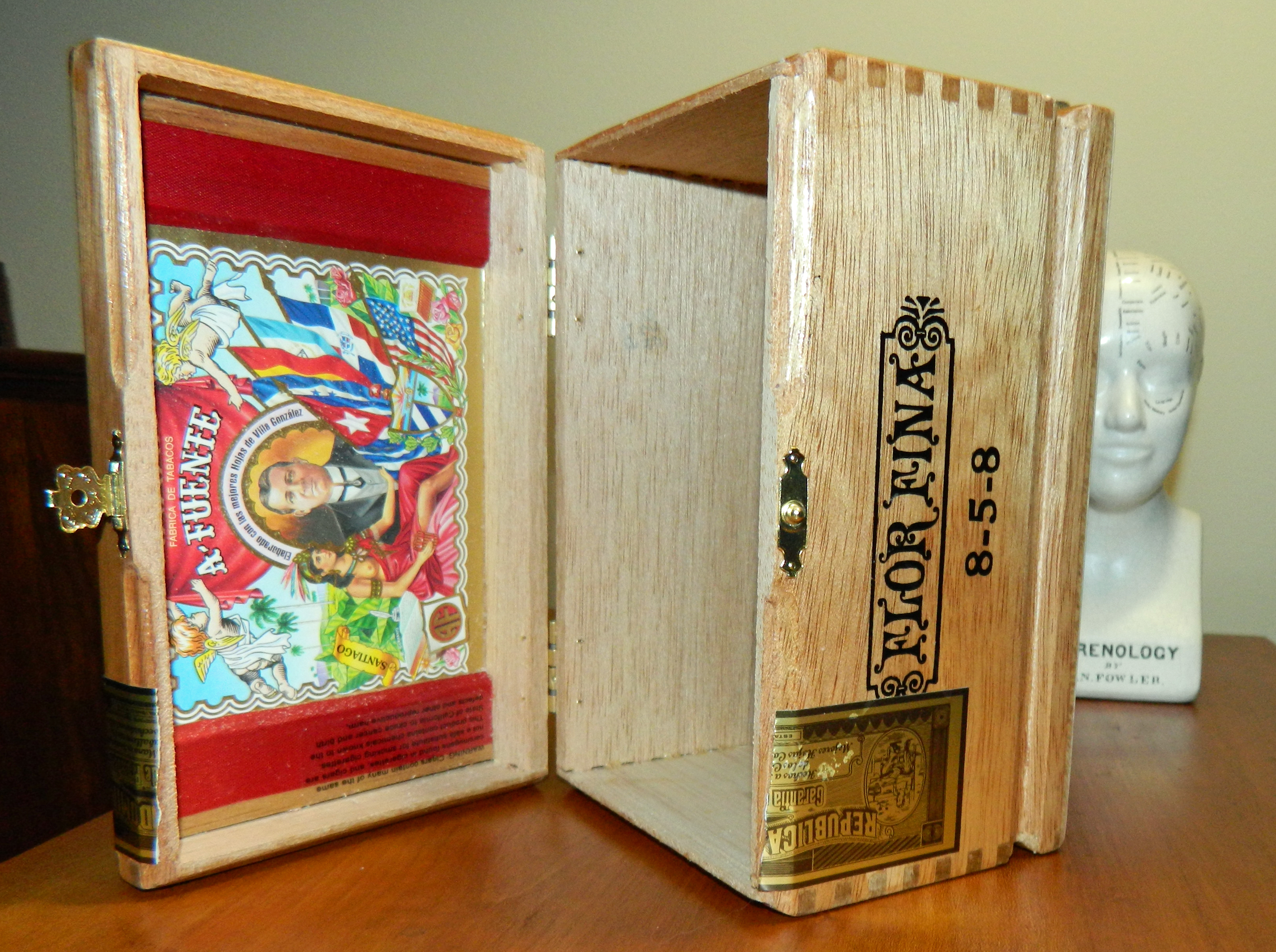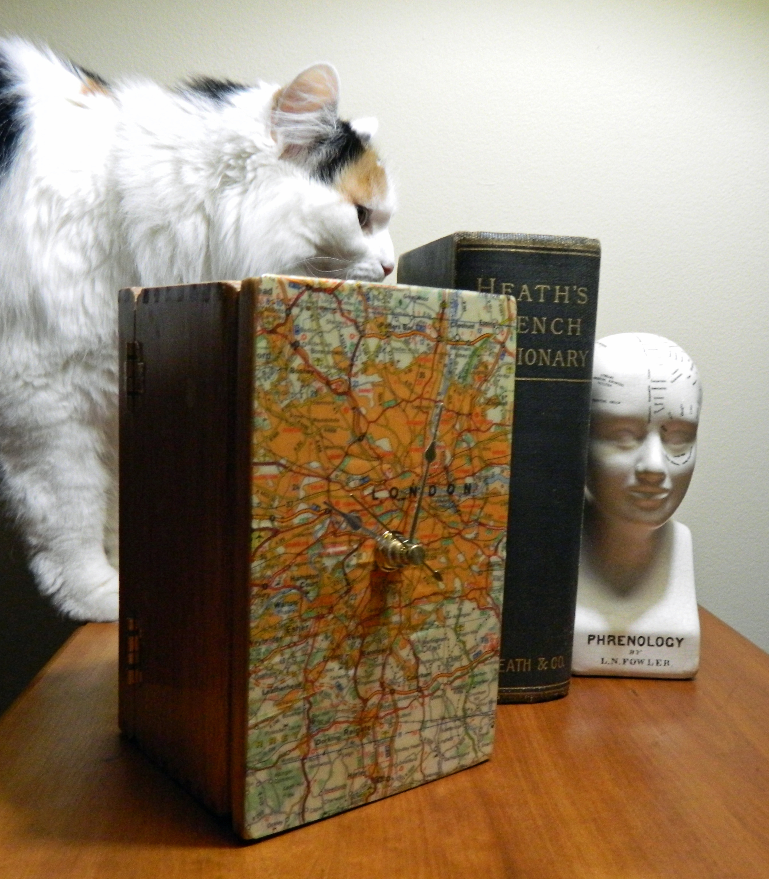 My favorite is the cigar box clock. Nice clean wooden cigar box that is exactly the right shape to sit on a shelf or end table. It also is a fun spot to “hide” things, and the clock faces are vintage maps or illustrations from old books.