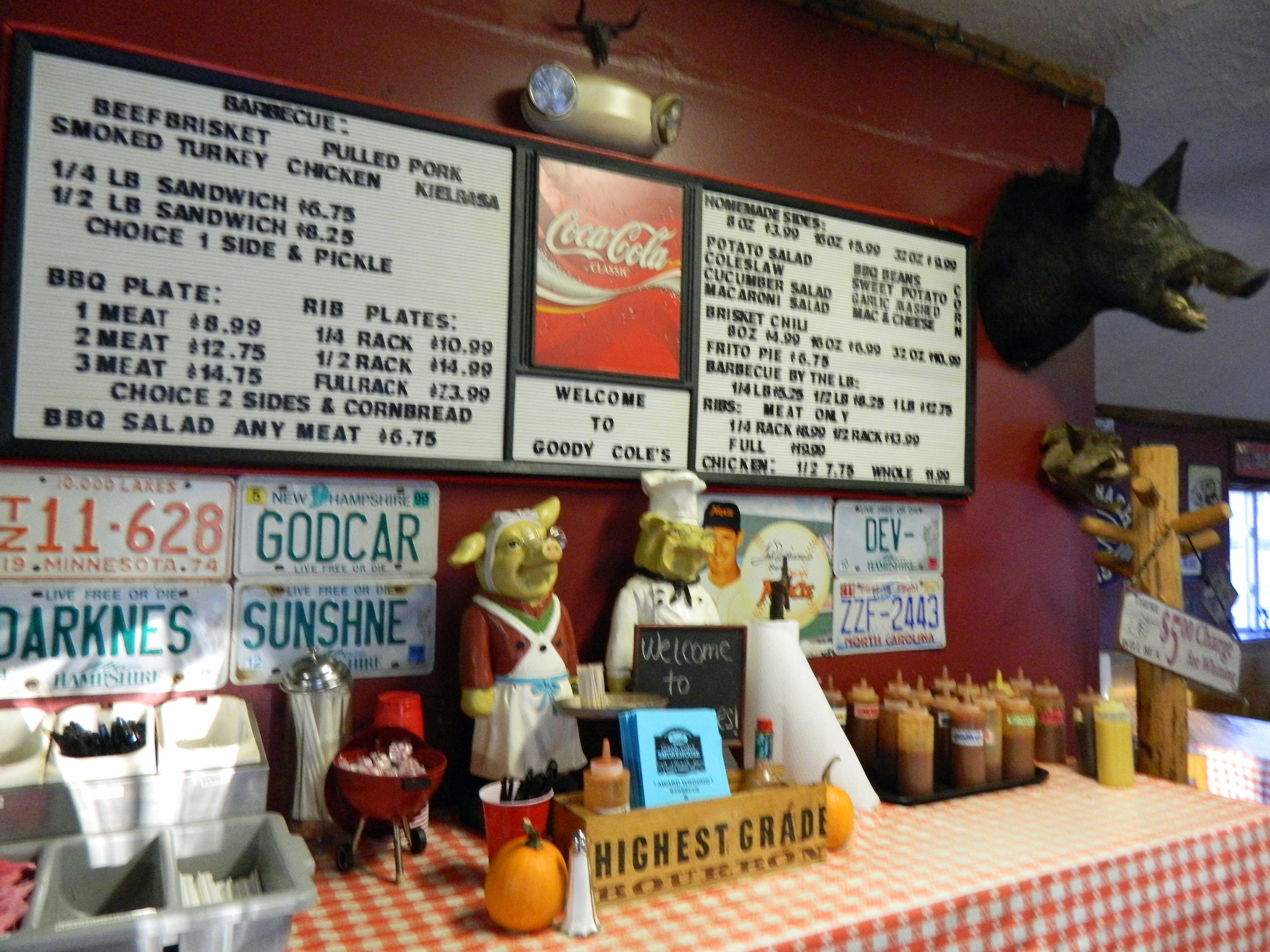 Goody Cole’s Smokehouse in Brentwood NH was about as good as BBQ gets in the North. I knew it was good when I walked in and it just smelled so delicious my mouth started watering. The red checked table clothes are pure Texas BBQ tradition, as were the taxidermy heads. I never mind dead animals watching me eat my food.