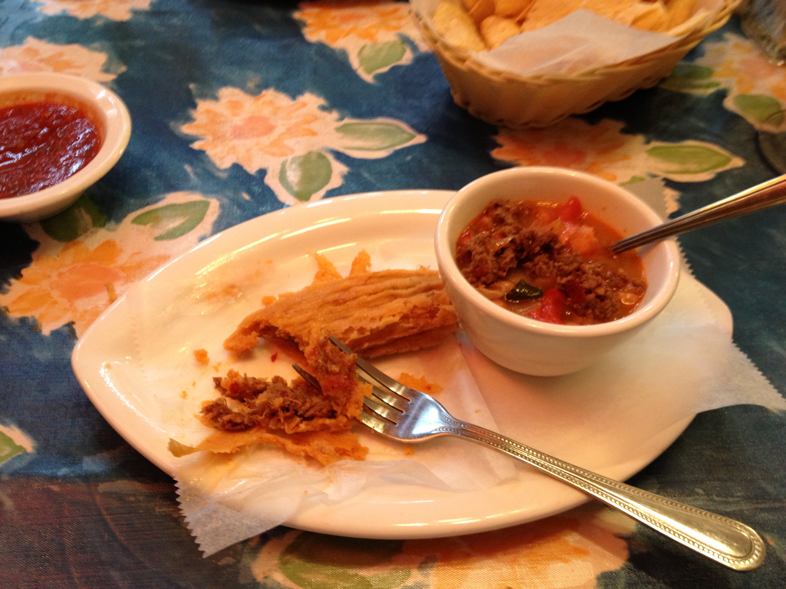 The first thing she brought, besides the ubiquitous chips and salsa, was a plate of “starters”, which consisted a large tamale and a bowl of meaty borracho beans. After this, I was completely full! Her margaritas are excellent, complete with little chunks of fresh mango, adding color and flavor to a traditional style drink. In order to really evaluate it properly, we naturally had to order a second one. You know, for science.