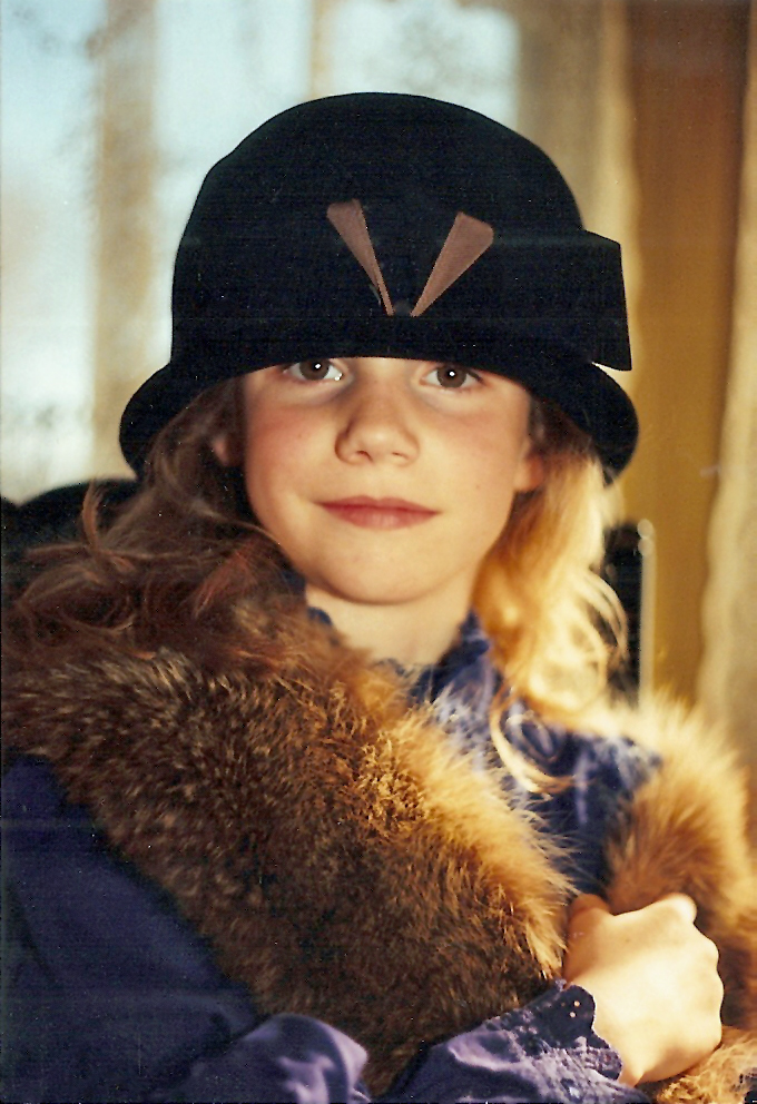 My daughter Evelyn sporting a vintage hat. She collected vintage hats when quite young, and they make an interesting collection on top of cabinets in the living room now.