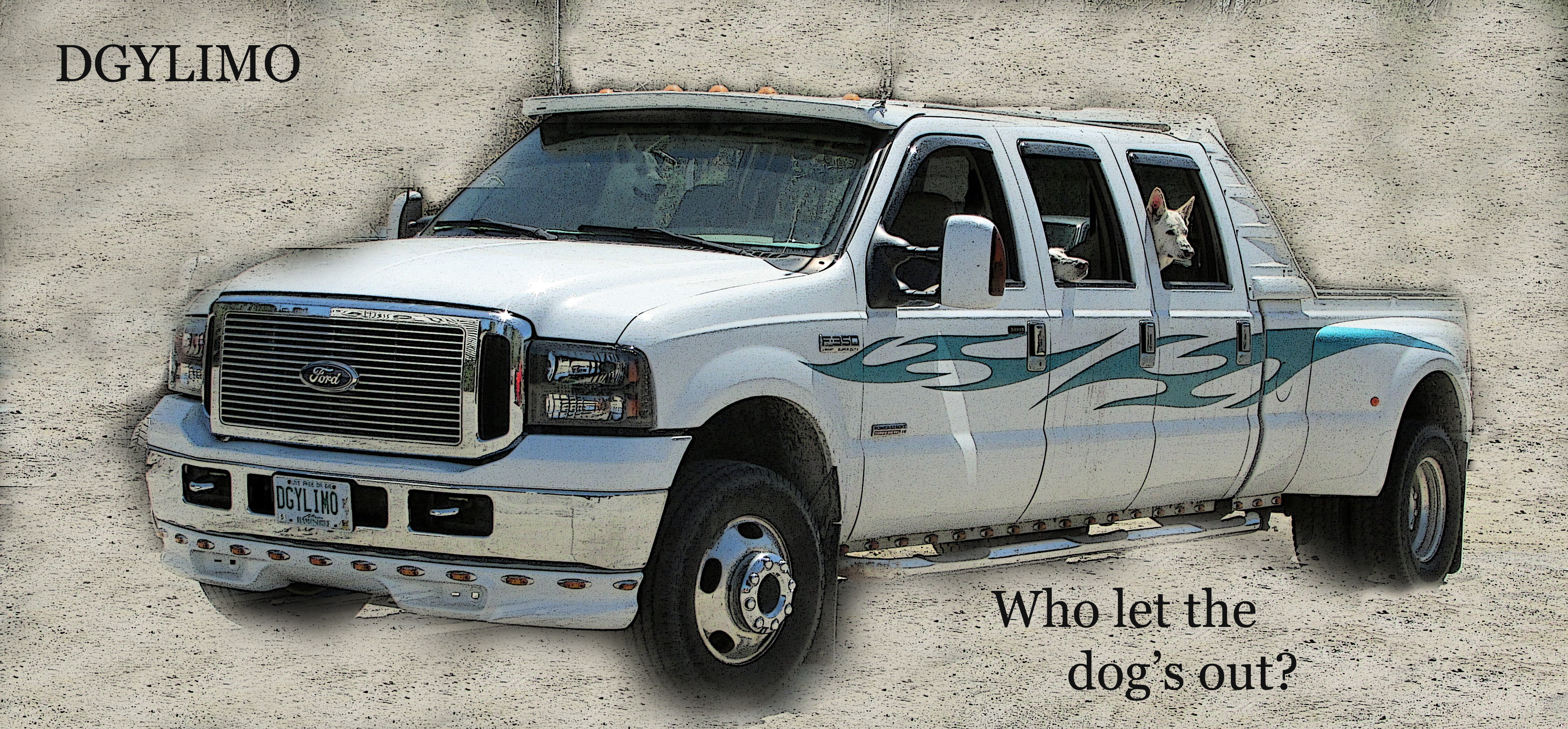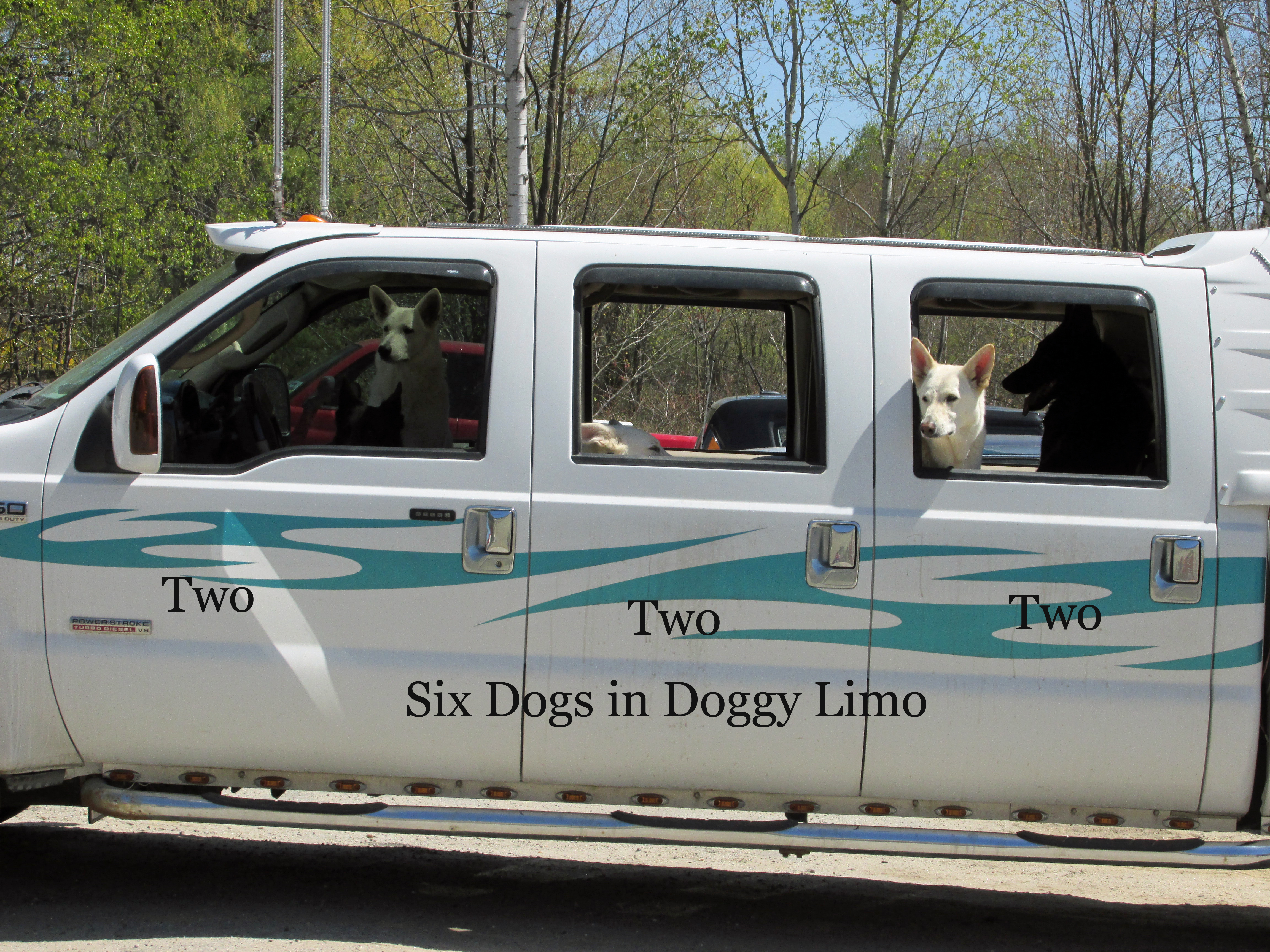 Hillsborough New Hampshire is where I saw the DGYLIMO. I was first attracted as I didn’t know you could get a truck with that big a cab. Then I noticed the beautiful dog. Then I noticed the beautiful dogs. Turns out there were 6, a mix of black and white. The dogs were well behaved, happily awaiting their owner, or driver, with the windows all down.