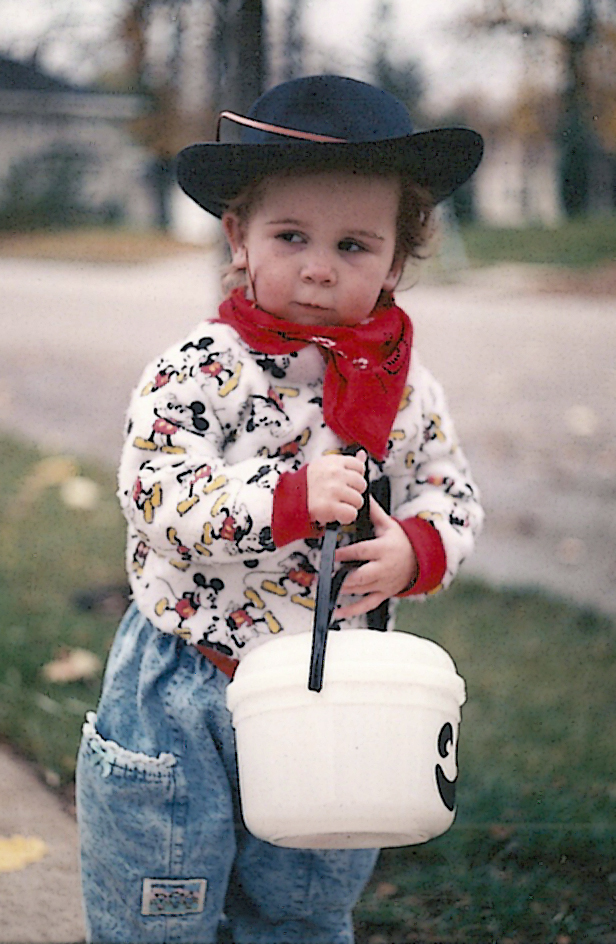 My second daughter Aynsley, enjoying daytime trick or treating. She’s wearing a black hat…because even at that age being the bad guy is more fun.