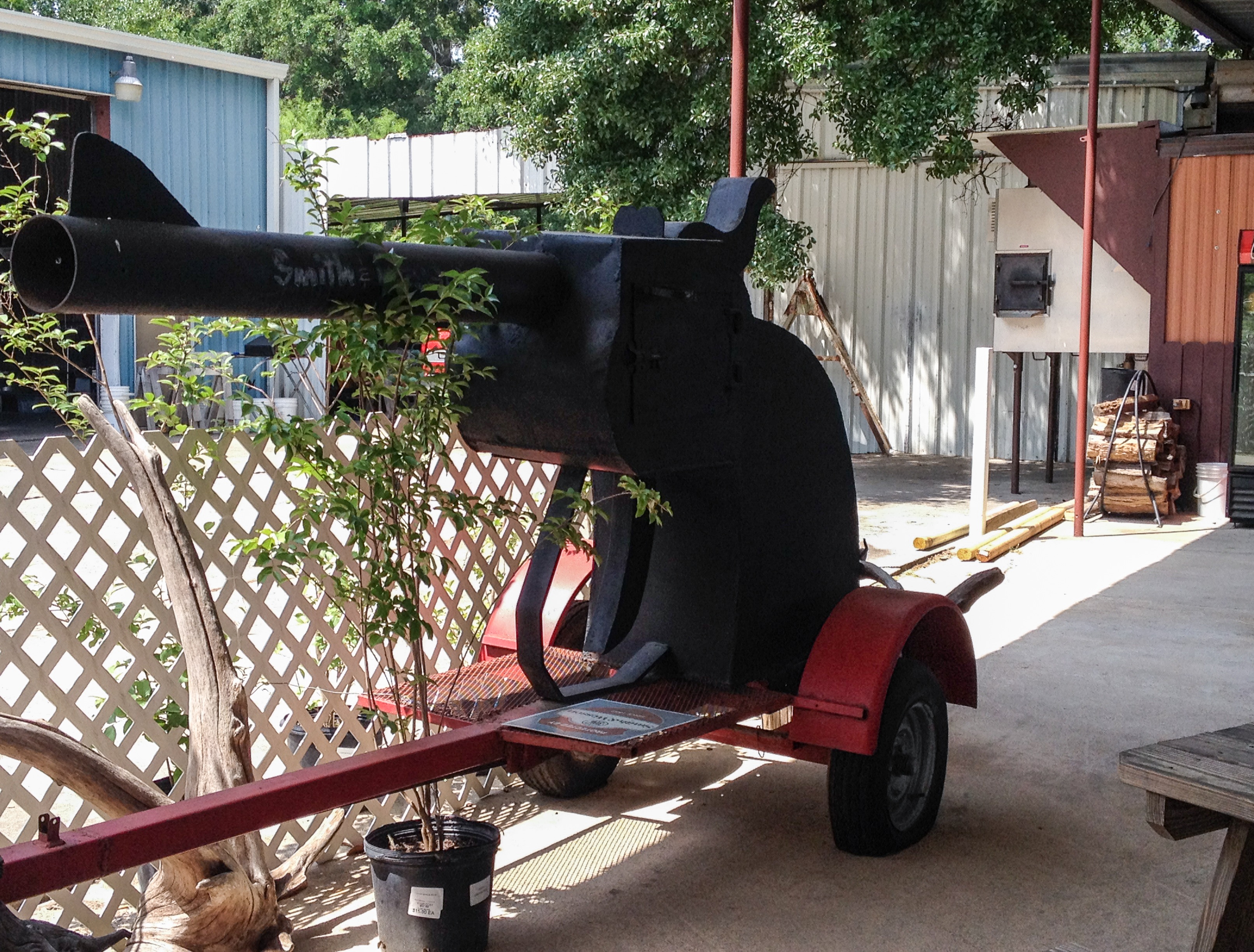 Jimee’s is a barbeque truck located spitting distance from Bush Intercontinental Airport, located on a side road. One side of the road is lined with pines, which hide the boundaries of the airport property. The truck is nestled between a RV storage business and more uncleared pine forest. Eric reported that at 5 p.m., the tiny parking lot is full of cars (always a good sign). A few old picnic tables are located under a large awning, so lunchtime eating is an option if it’s not high summer.