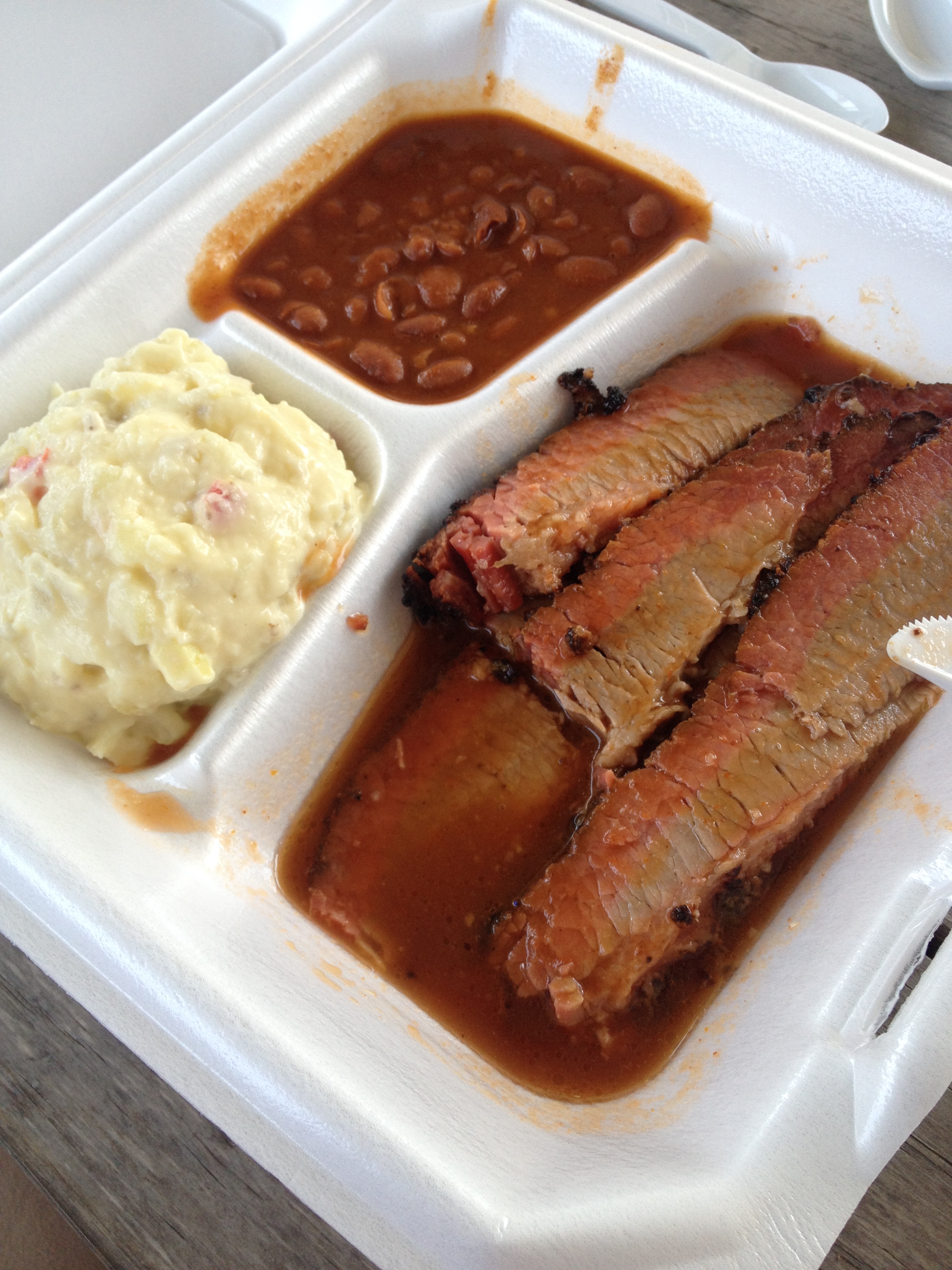 A small side of potato salad, and standard Ranch-Style Beans rounded out the meal, although you could also get coleslaw or mac ‘n cheese. The guy at the adjacent table was smacking down on a rib, and they looked wonderful, as well.