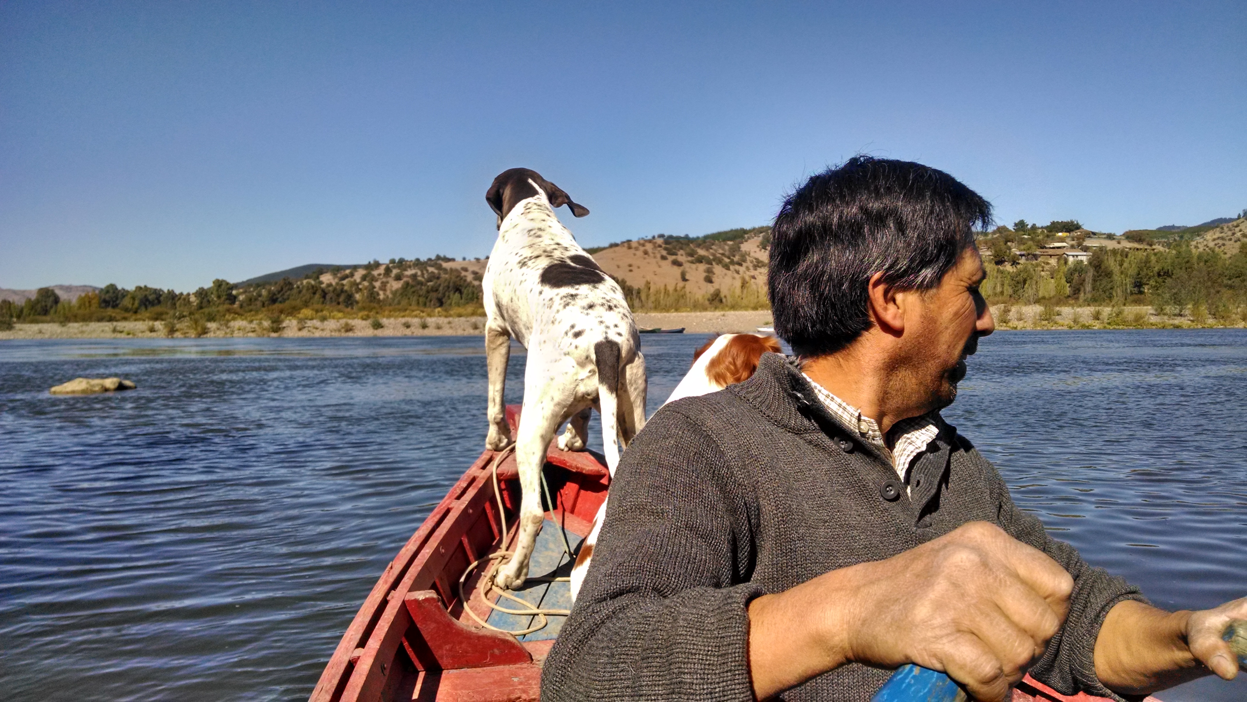 Eventually, we pulled into a tiny town, called ‘Gonzales Bastias’, which had the requisite number of Chilean stray dogs, and one dusty restaurant that didn’t appear to offer more than a couple of handmade empanadas. Again, applying my pidgin Spanish, we asked the restaurant owner ‘Donde Vina Gonzales Bastias’ – he could tell I can’t really speak Spanish, so he just gestured for us to follow him. We left the car, windows down, unlocked (not realizing we were embarking on another journey) and walked with him down to the river bank. He pulled over a rickety old row boat, two dogs jumped in the boat, and he motioned for us to follow suit.