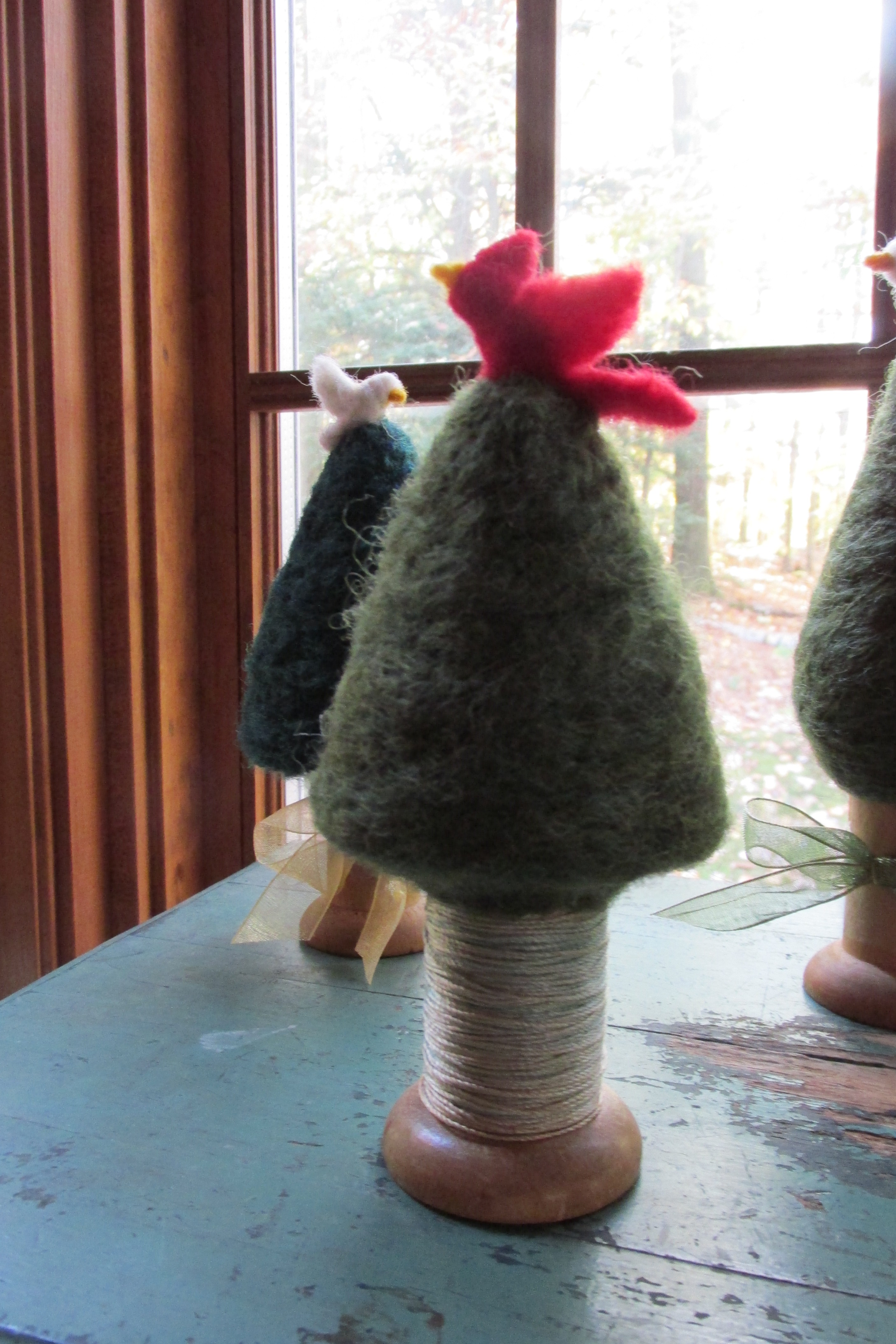 The original item was a spool with wool felted on top to make it look like a holiday tree. There are metal bits out the top with stars and such.