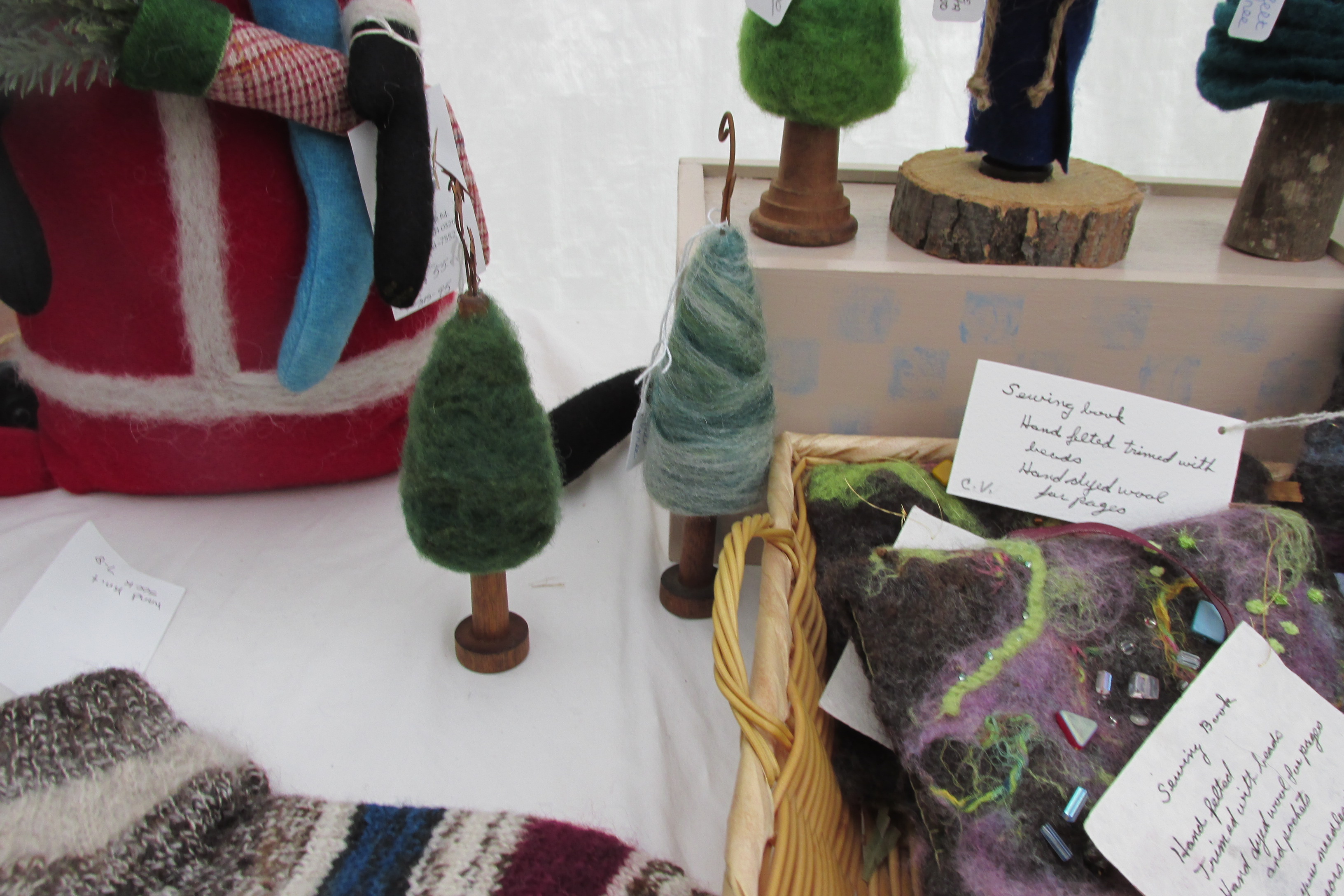 I don’t sell items. But I am sometimes inspired by the work of others (they were probably inspired by an article in a crafting magazine). Since I am doing wool felting, I have been trying NOT to be inspired by others. I know I do my best work when I go with my own imagination. So I have avoided youtubes and articles and books on wool felting. Still, recently at Wool Weekend in Hillsborough NH I was inspired to do some holiday gifts by an item being sold.